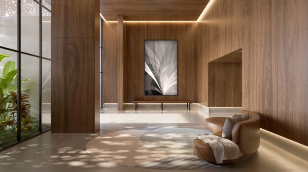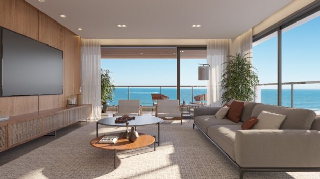 O ritmo da vida urbana se encontra com a leveza e a qualidade de vida da praia, todos os ambientes equipados, decorados e mobiliados. O hall de entrada com moveis da Saccaro.