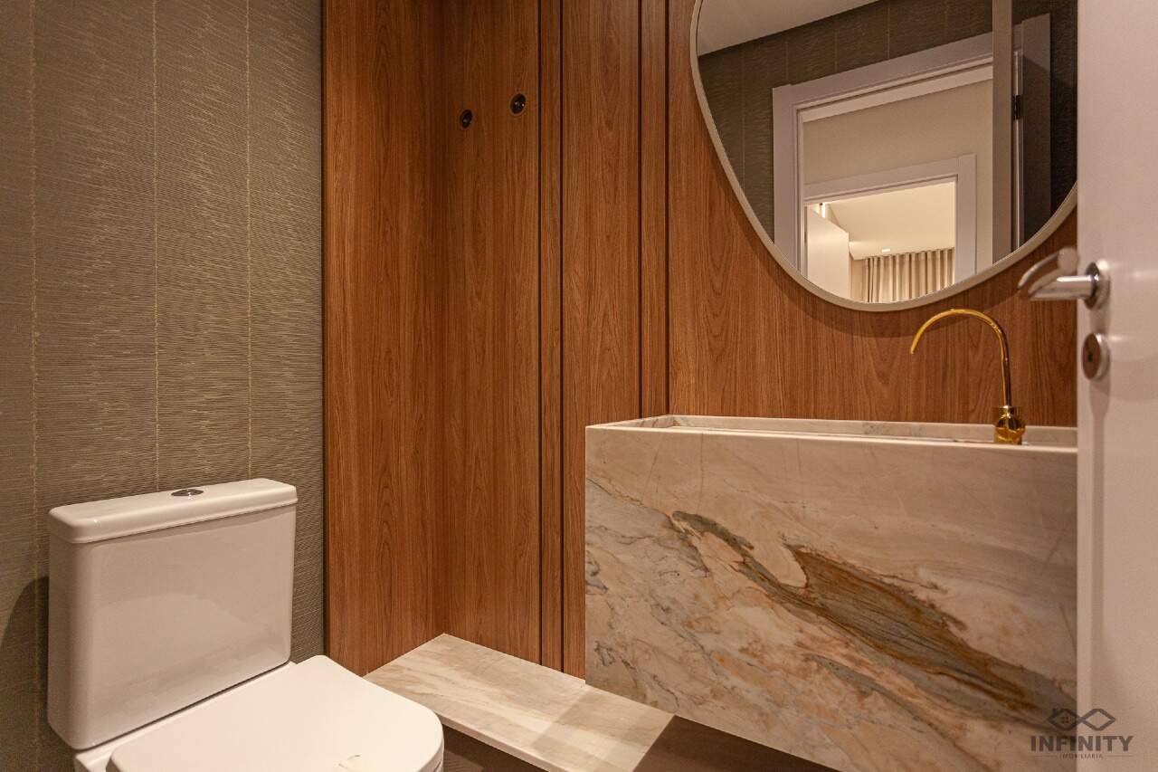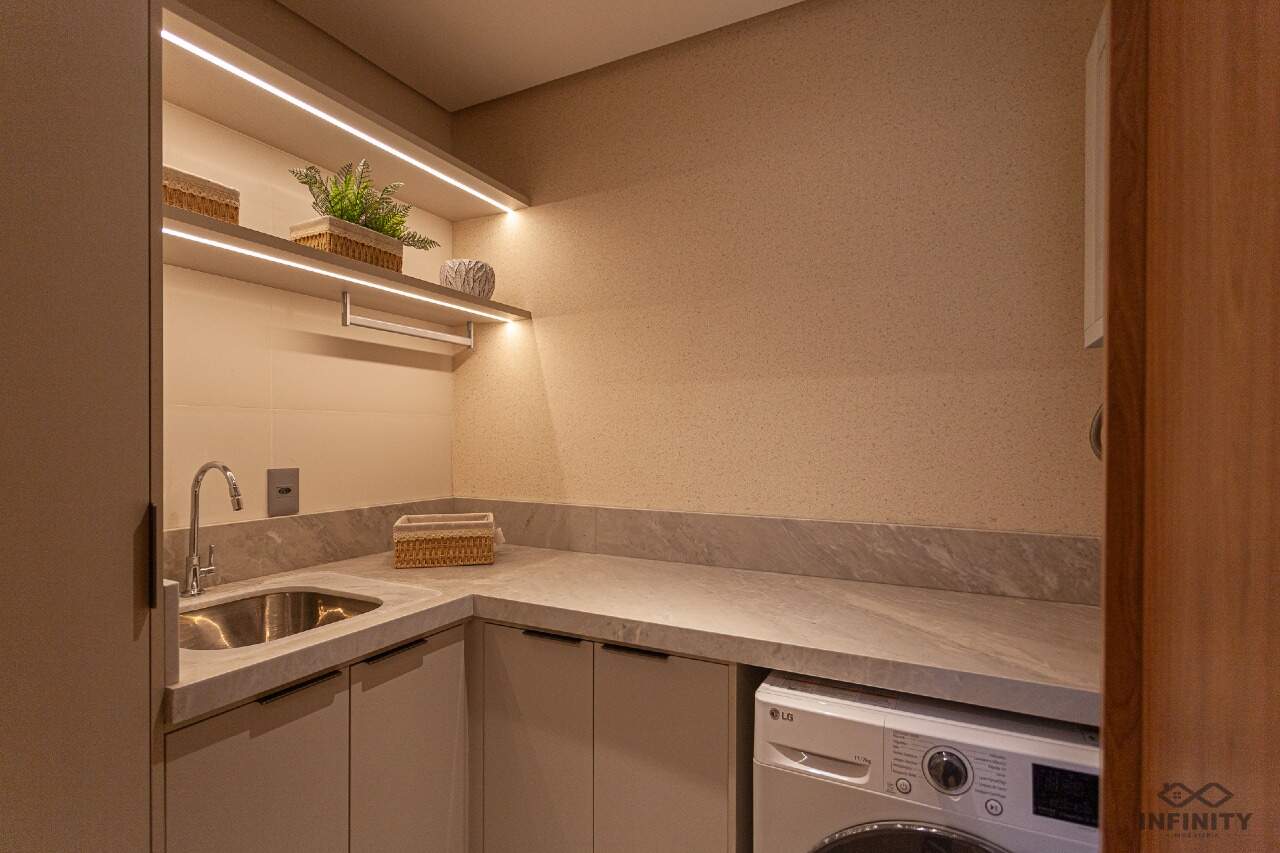 As pedras de mármore utilizadas no balcão da cozinha, assim como nos balcões de banheiro e também na lavanderia, são maravilhosas. Já o mármore utilizado no lavabo é um “show” à parte.