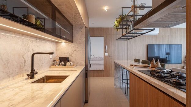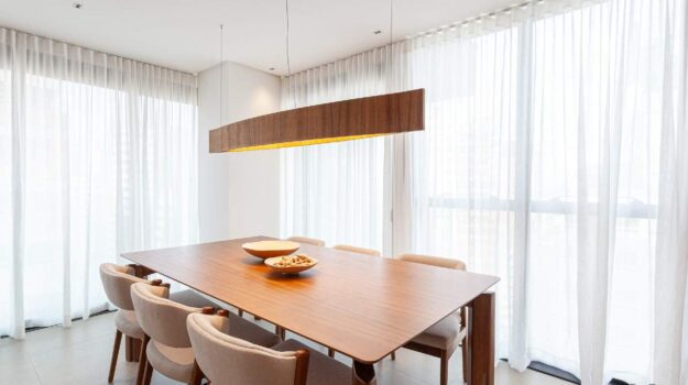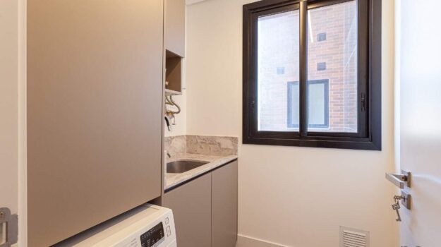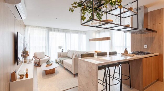 O ritmo da vida urbana se encontra com a leveza e a qualidade de vida da praia, todos os ambientes equipados, decorados e mobiliados. O hall de entrada com moveis da Saccaro.