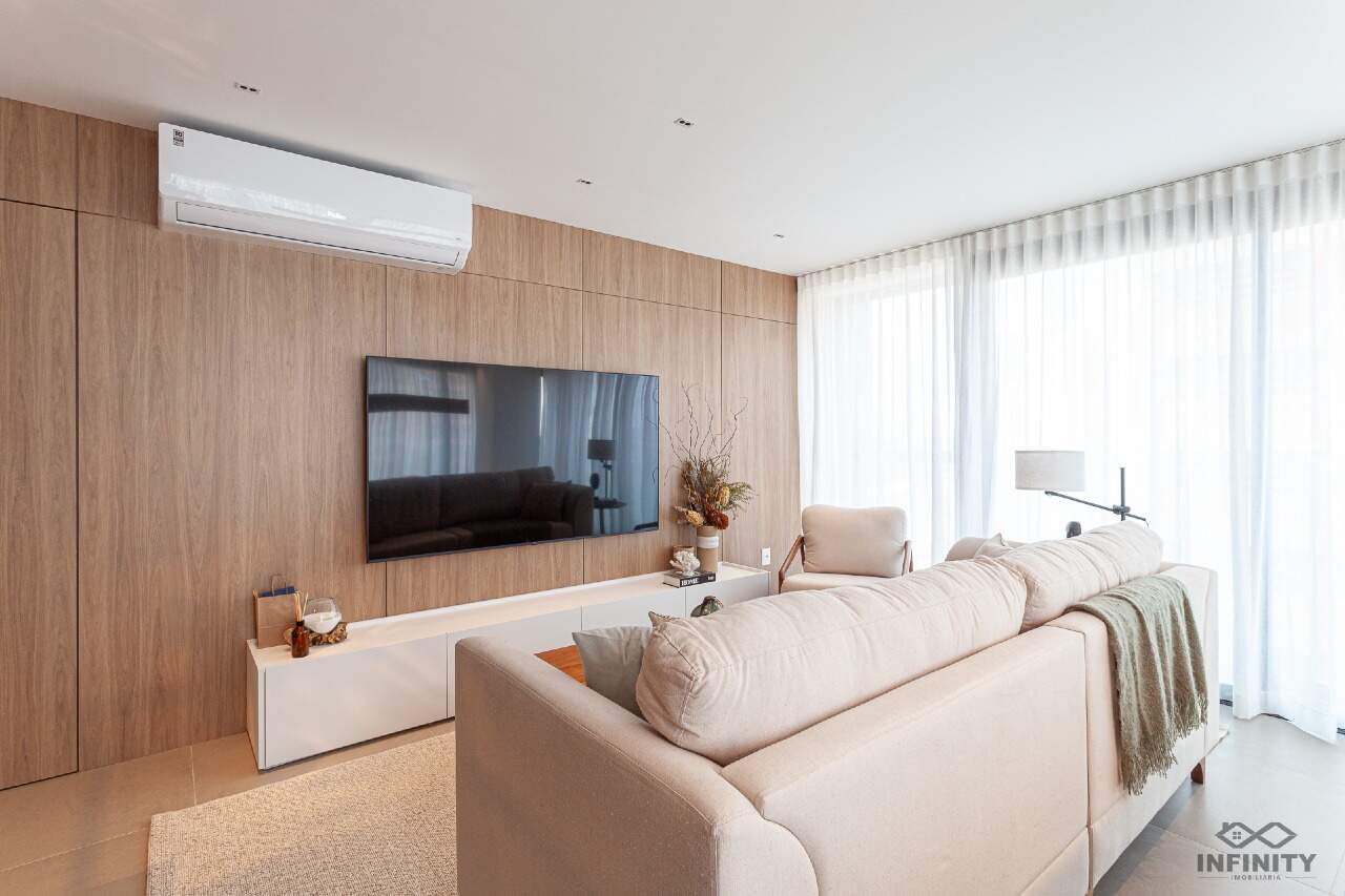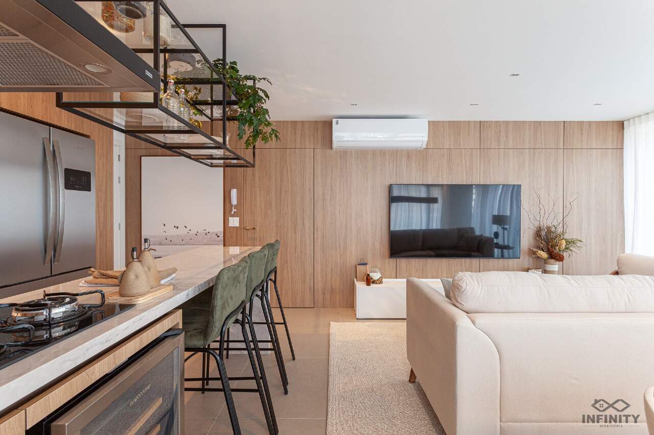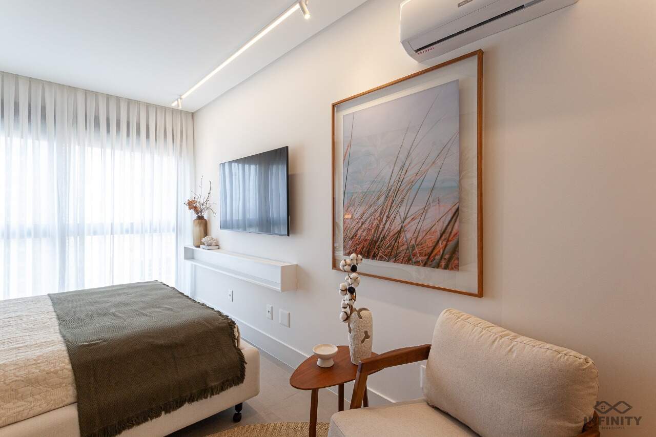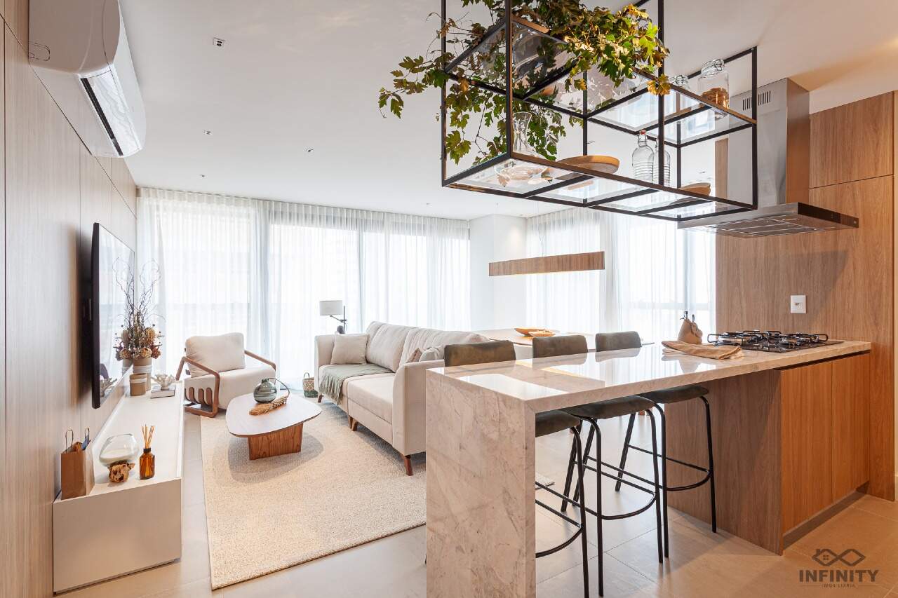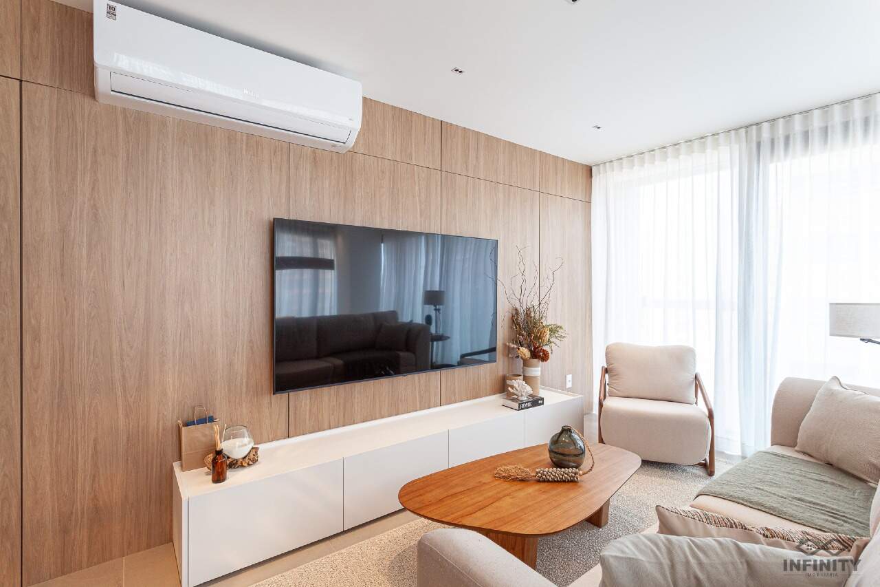 O ritmo da vida urbana se encontra com a leveza e a qualidade de vida da praia, todos os ambientes equipados, decorados e mobiliados. O hall de entrada com moveis da Saccaro.