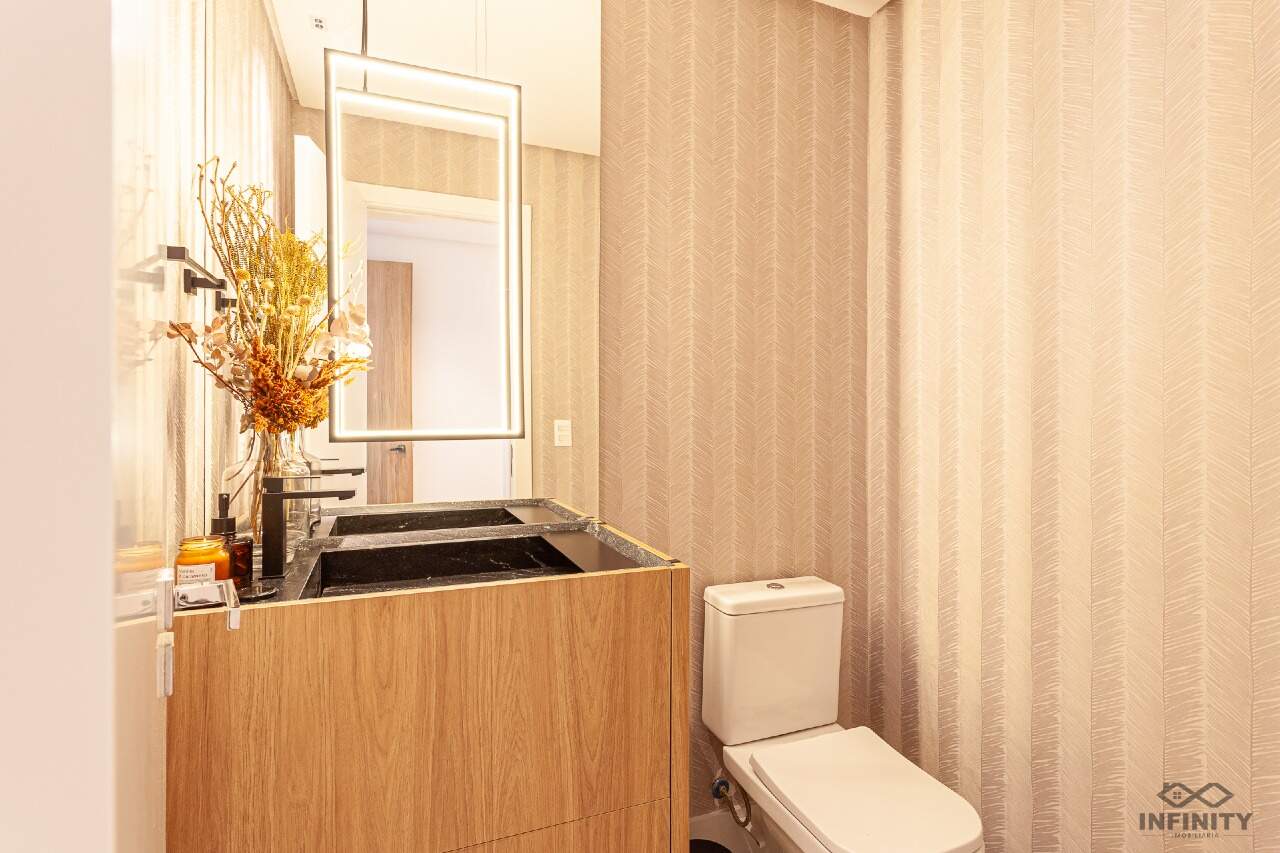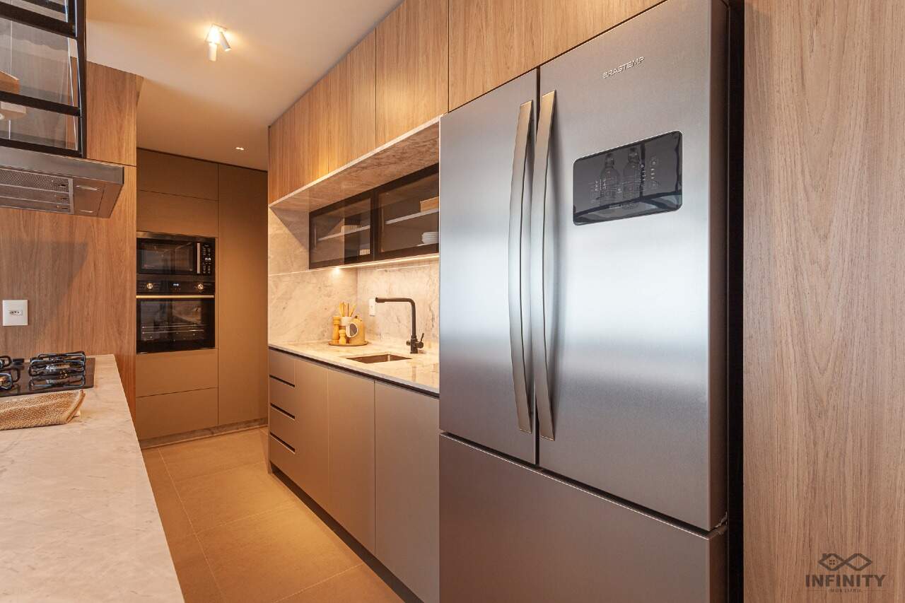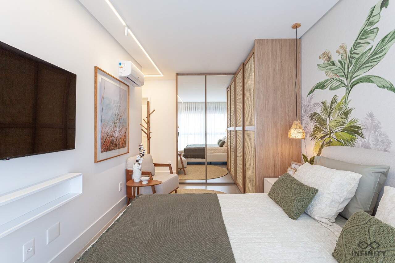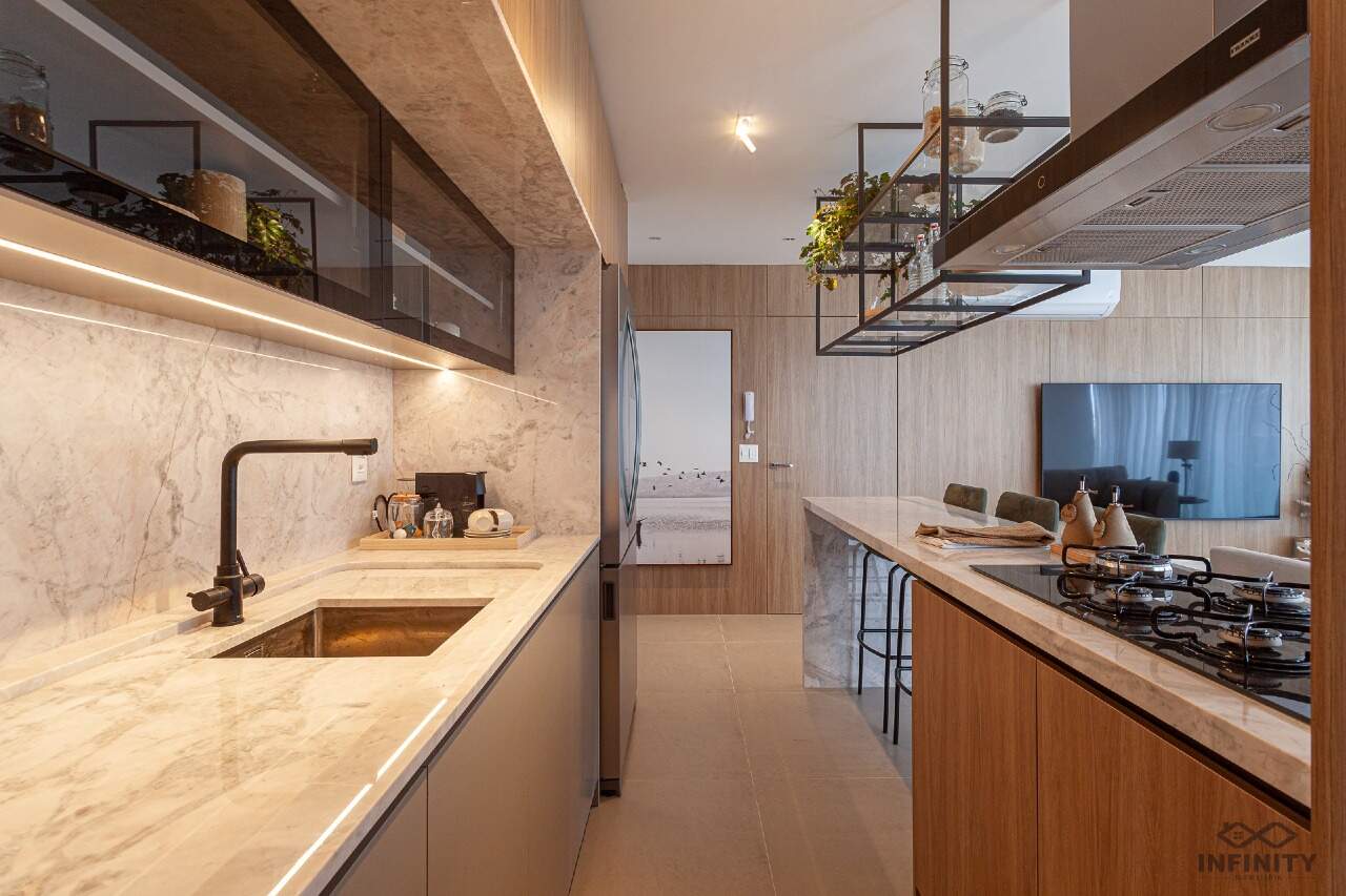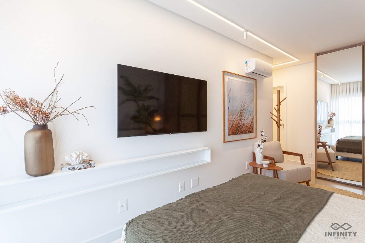 O ritmo da vida urbana se encontra com a leveza e a qualidade de vida da praia, todos os ambientes equipados, decorados e mobiliados. O hall de entrada com moveis da Saccaro.