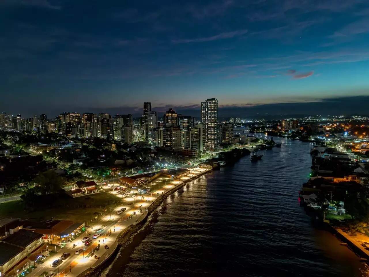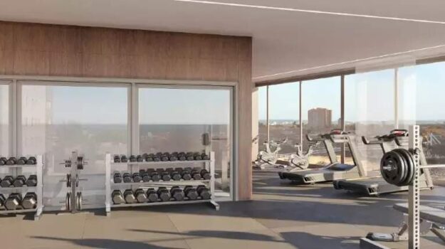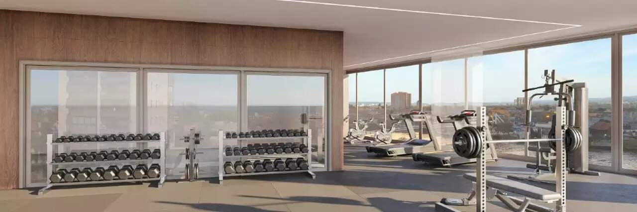 Academia e piscina com vista para o mar e rio, box de garagem com carregador para carro elétrico.