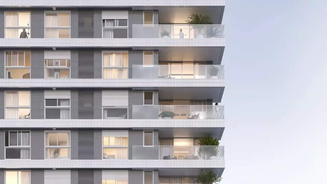 Um edifico com lojas comerciais no térreo. A cada pavimento são 04 tipos de apartamentos, em tamanhos diferentes.