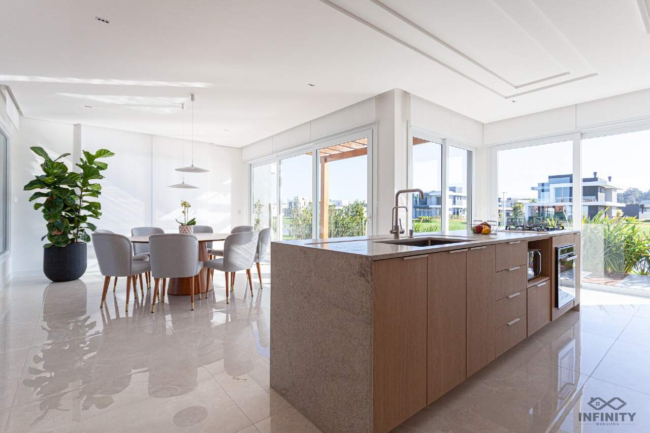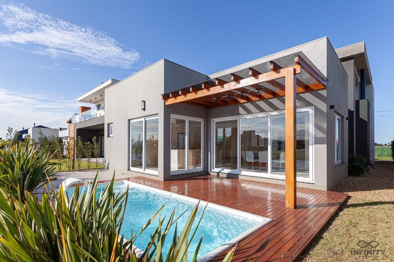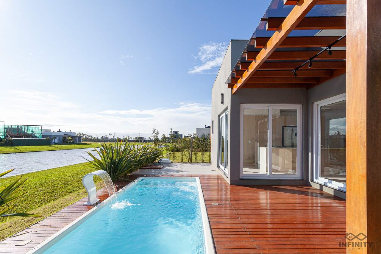 Nos fundos, um cenário encantador: a casa faz frente para o lago, trazendo tranquilidade e contato com a natureza. A churrasqueira já está posicionada para aproveitar a vista, e você ainda pode criar o jardim dos seus sonhos ou um espaço perfeito para seu pet correr livre.
