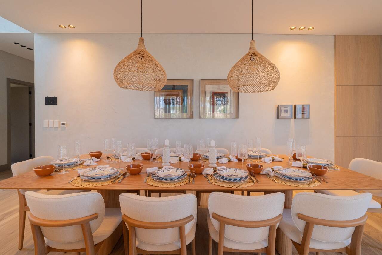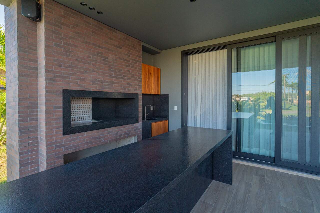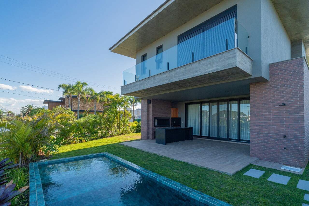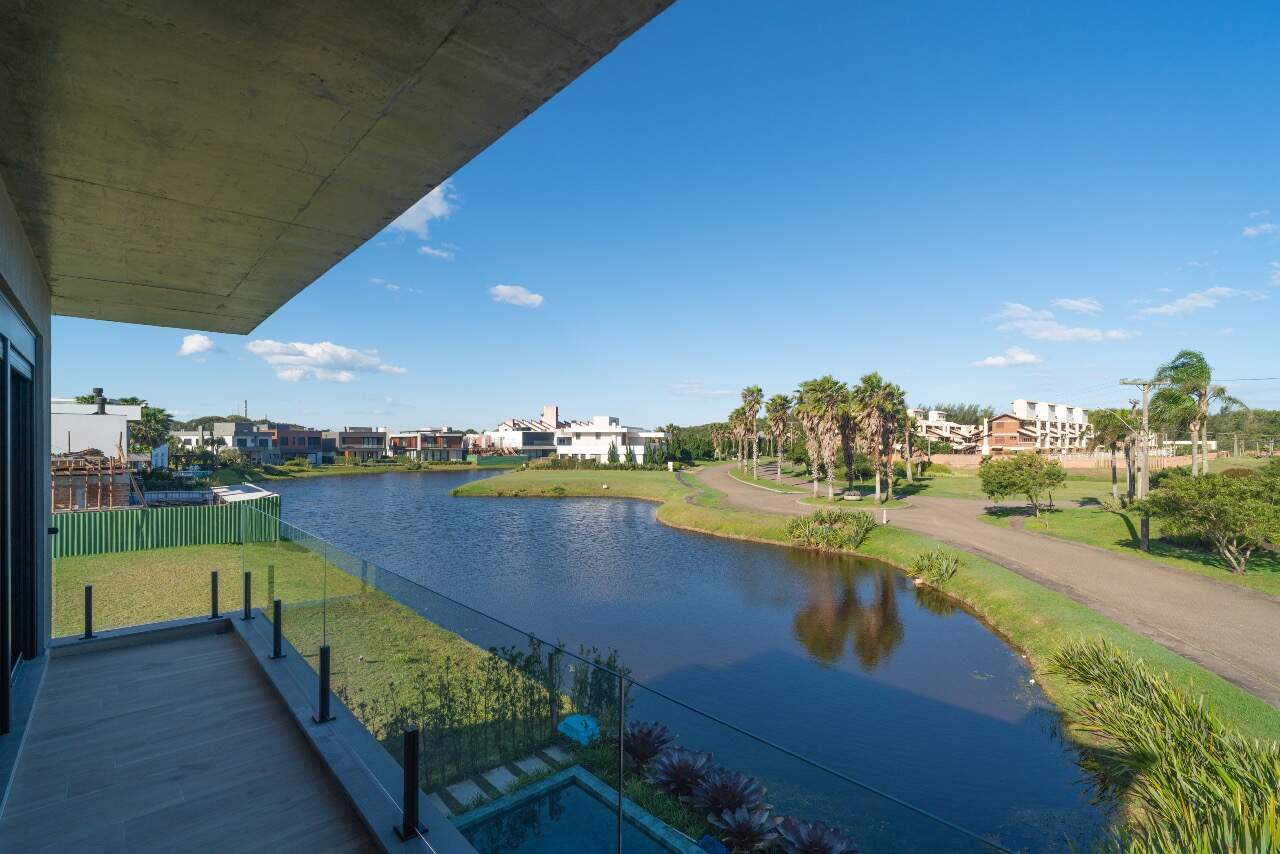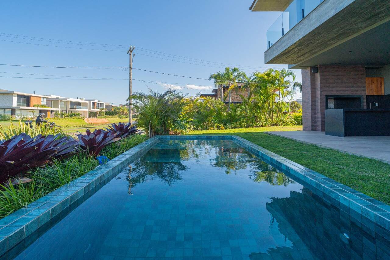 Para momentos de lazer, a casa conta com sala de cinema equipada com cinco caixas JBL, adega assinada pela arquiteta Sabrina Barros e uma piscina com vista privilegiada para o lago, perfeita para contemplar a natureza ao redor.