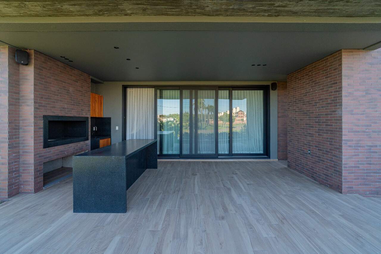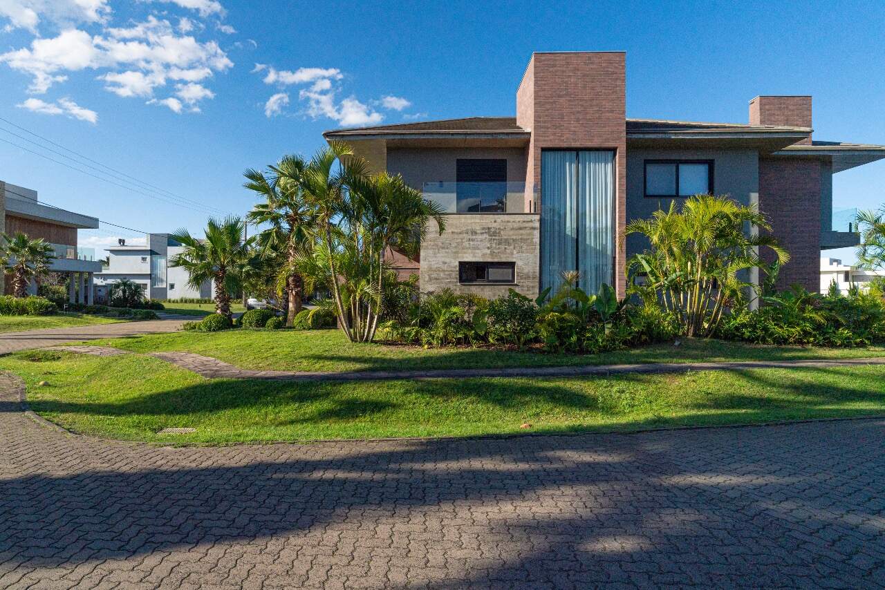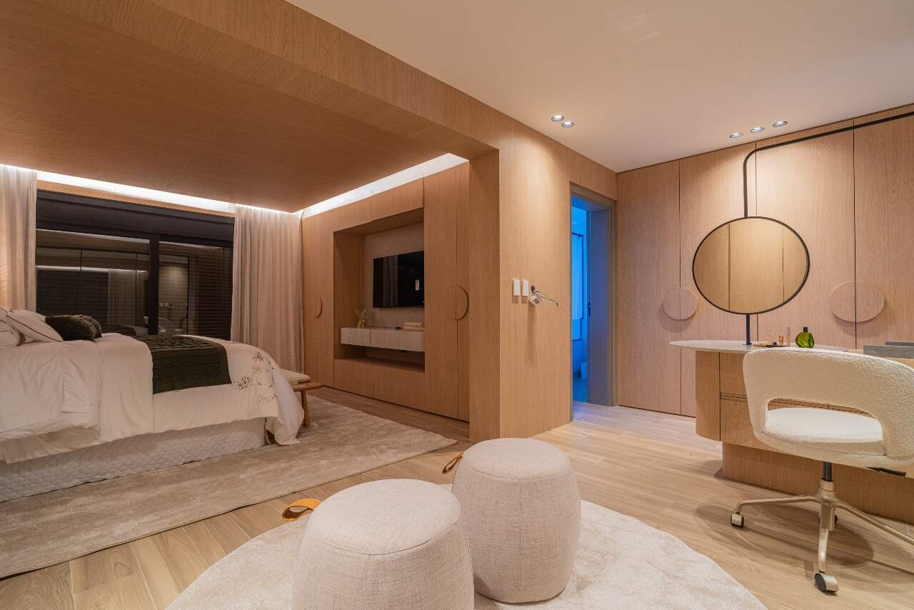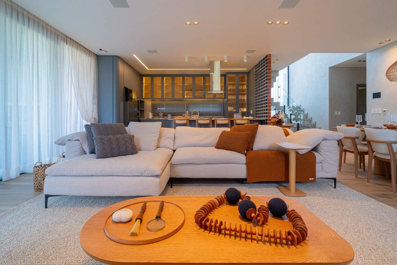 Para momentos de lazer, a casa conta com sala de cinema equipada com cinco caixas JBL, adega assinada pela arquiteta Sabrina Barros e uma piscina com vista privilegiada para o lago, perfeita para contemplar a natureza ao redor.