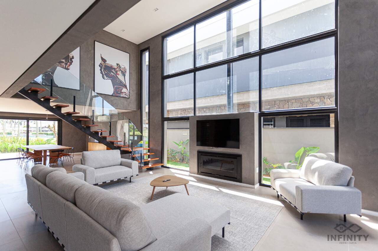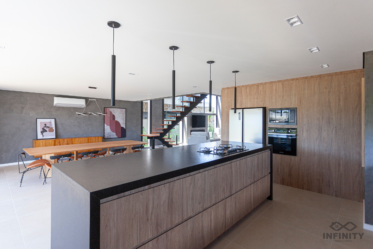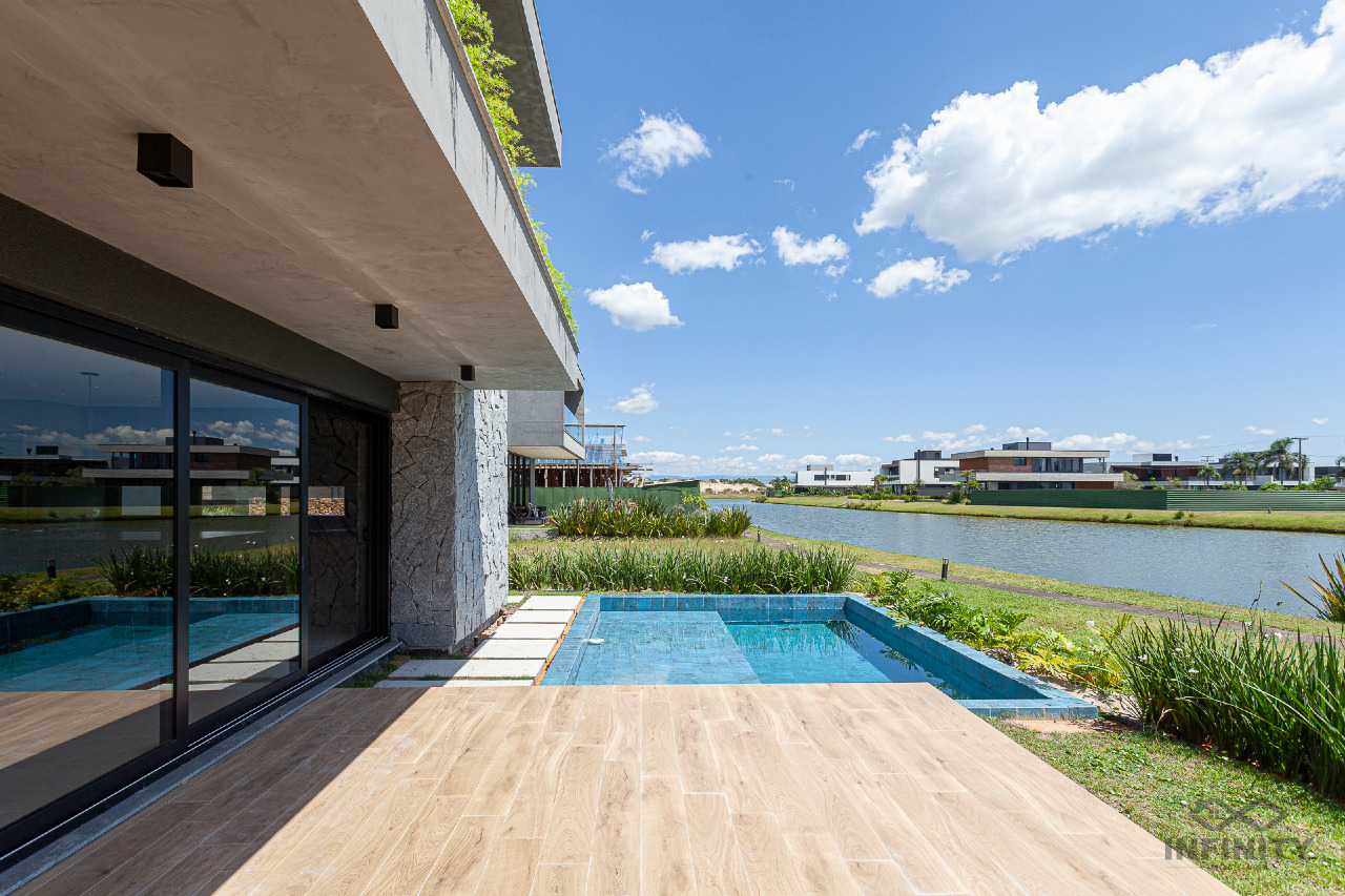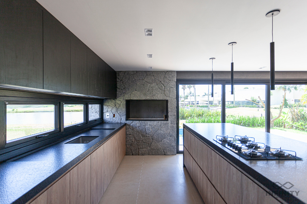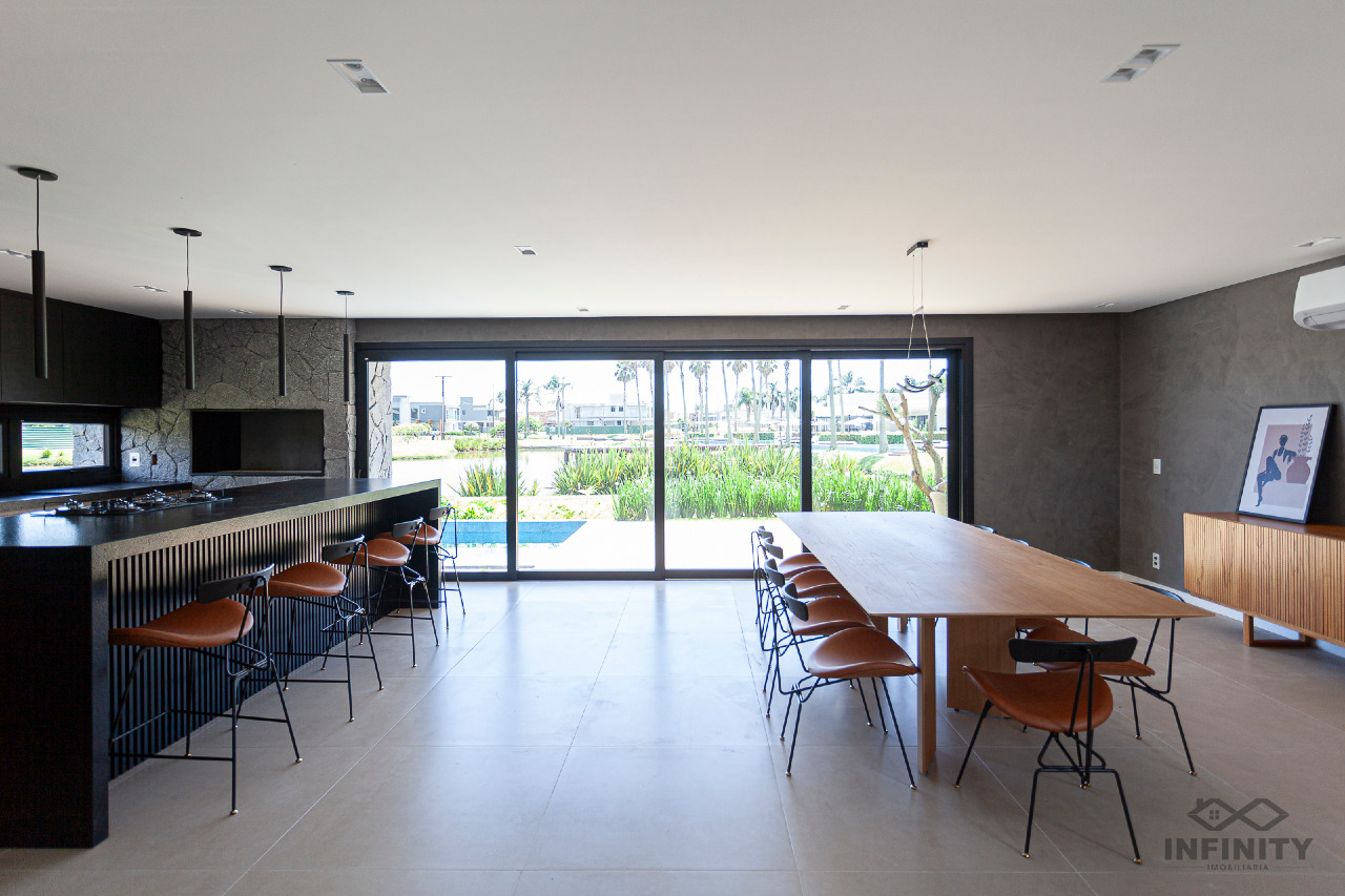 A cozinha tem conceito aberto, integrando-se a um amplo living com piscina e uma vista sensacional para o lago principal e palmeiras. A área externa conta com paisagismo que se integra aos móveis e à piscina.