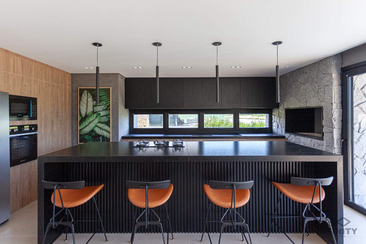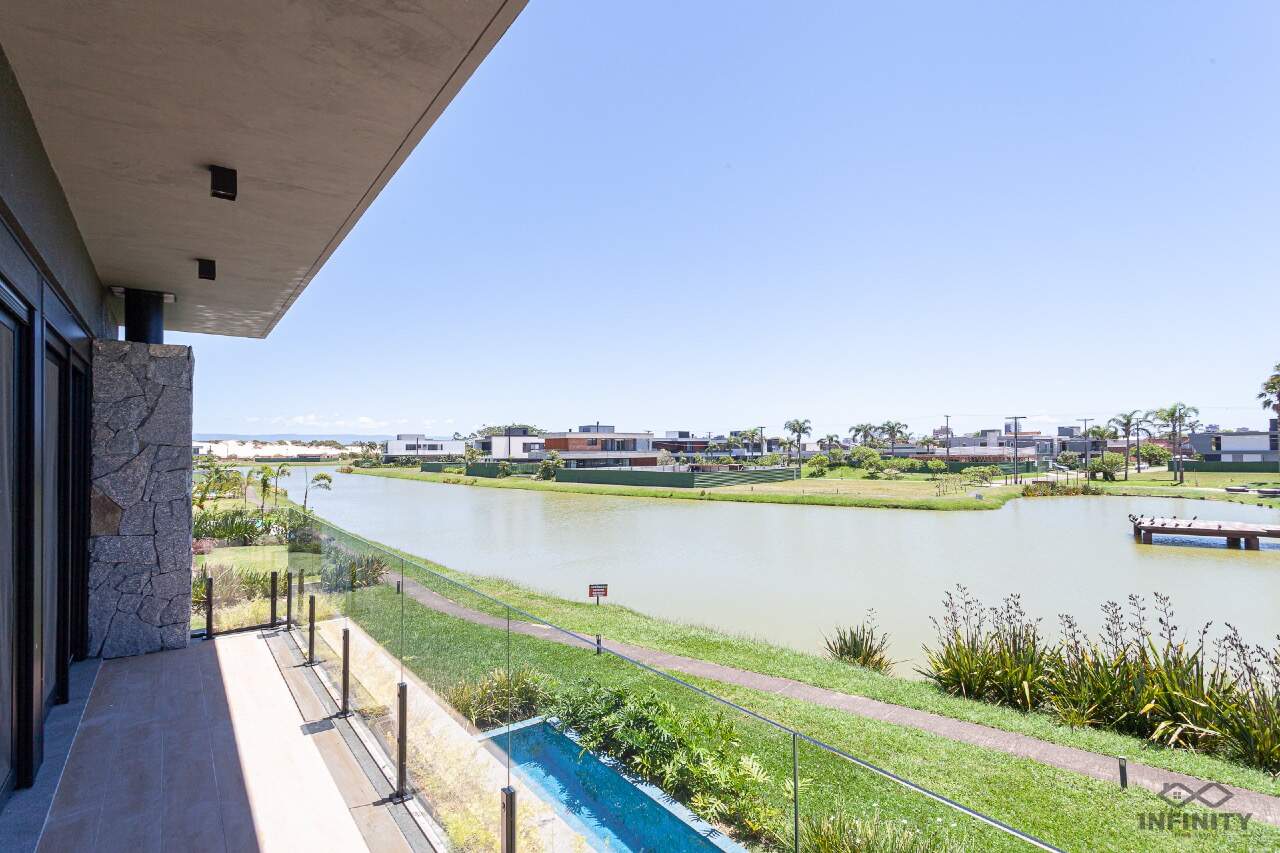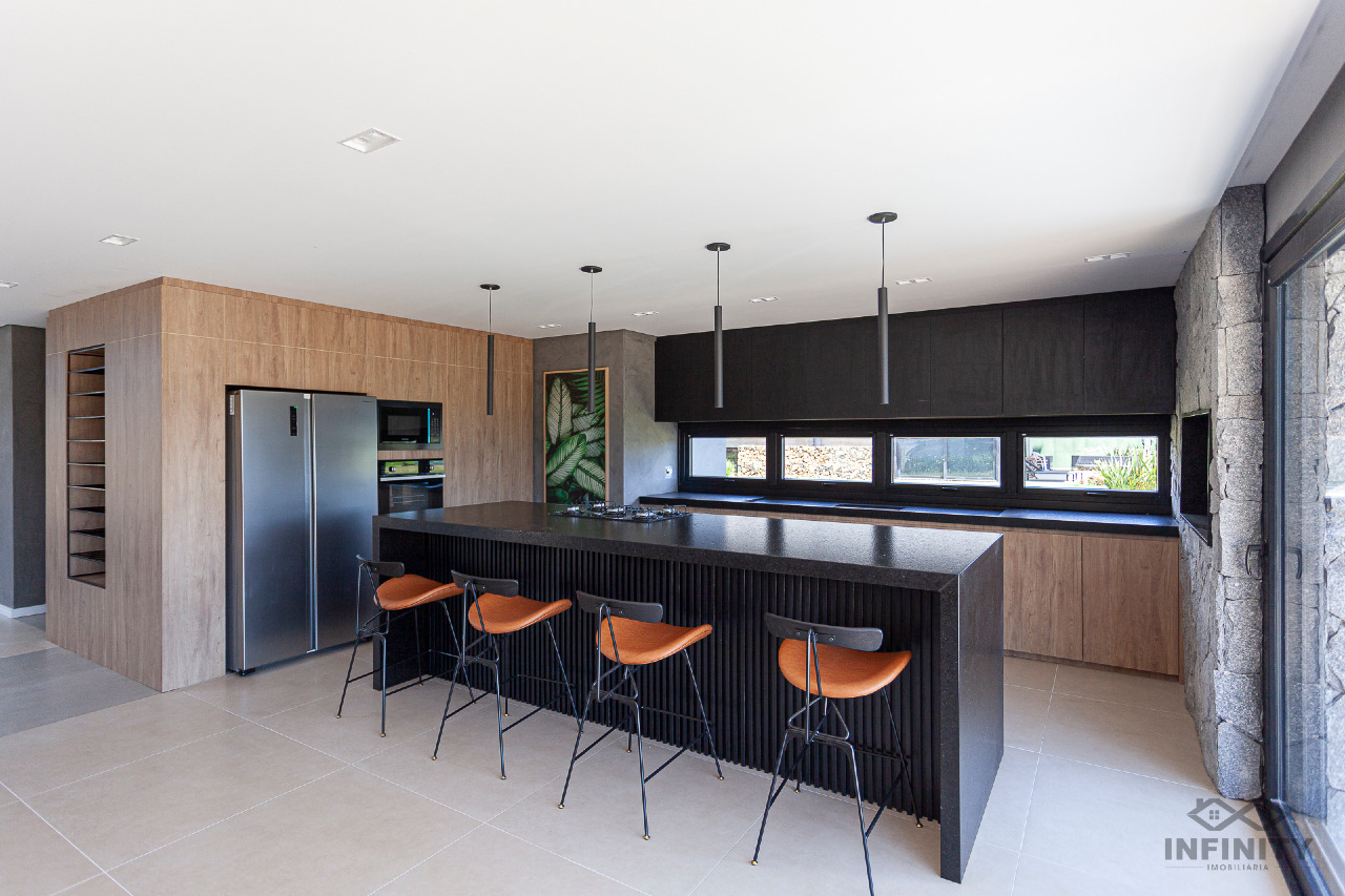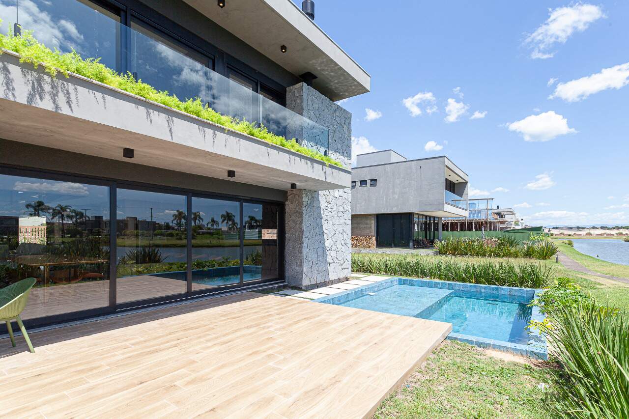 A cozinha tem conceito aberto, integrando-se a um amplo living com piscina e uma vista sensacional para o lago principal e palmeiras. A área externa conta com paisagismo que se integra aos móveis e à piscina.