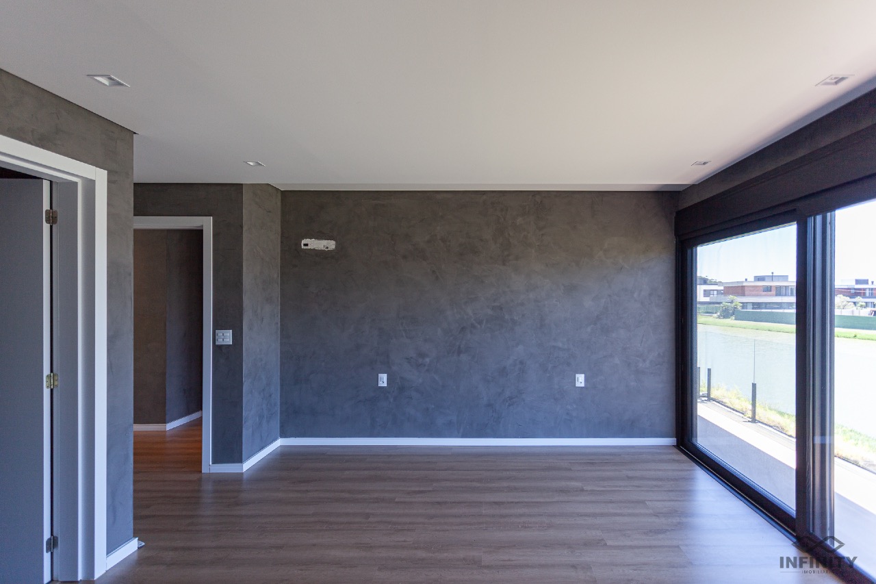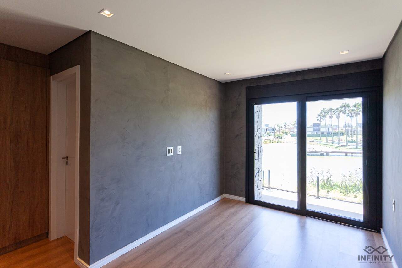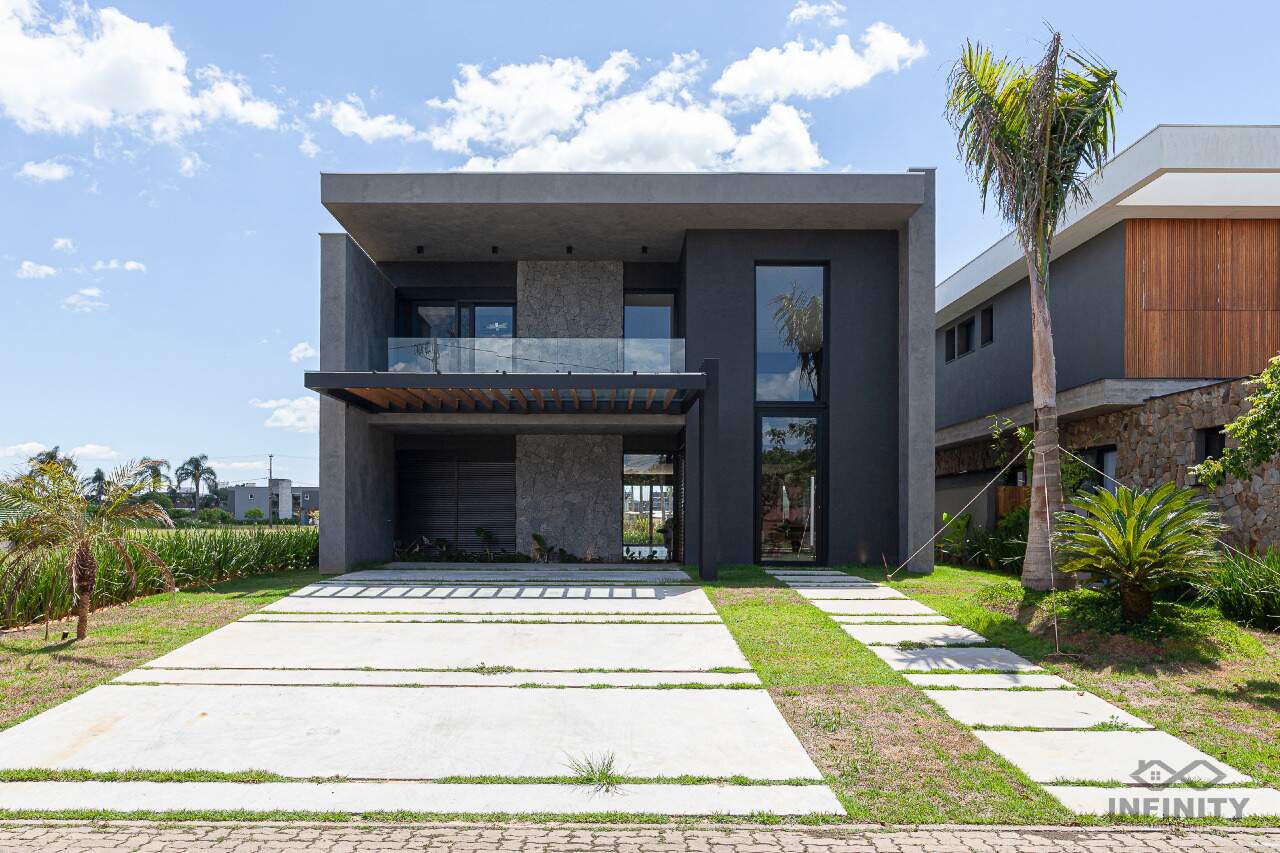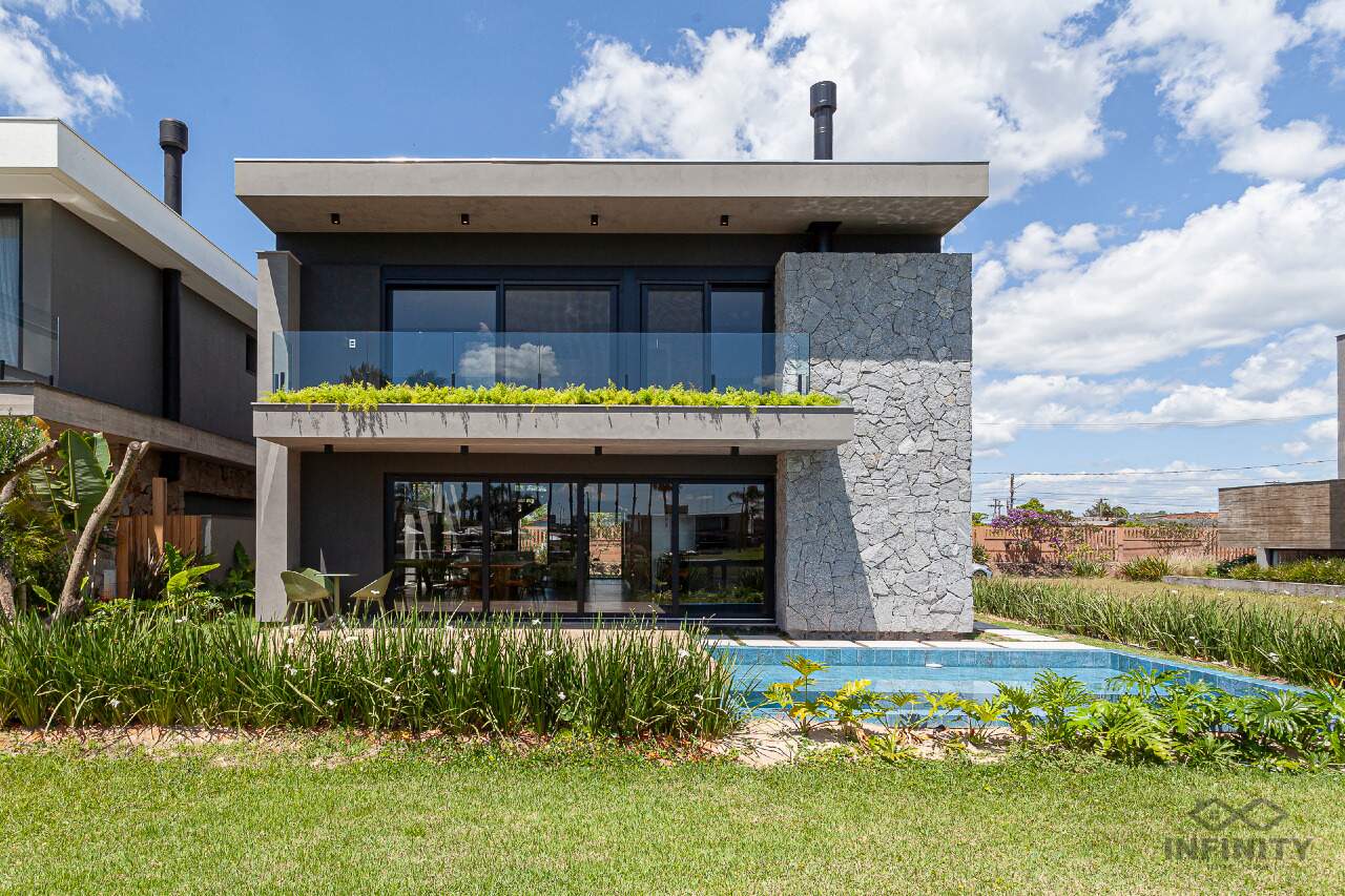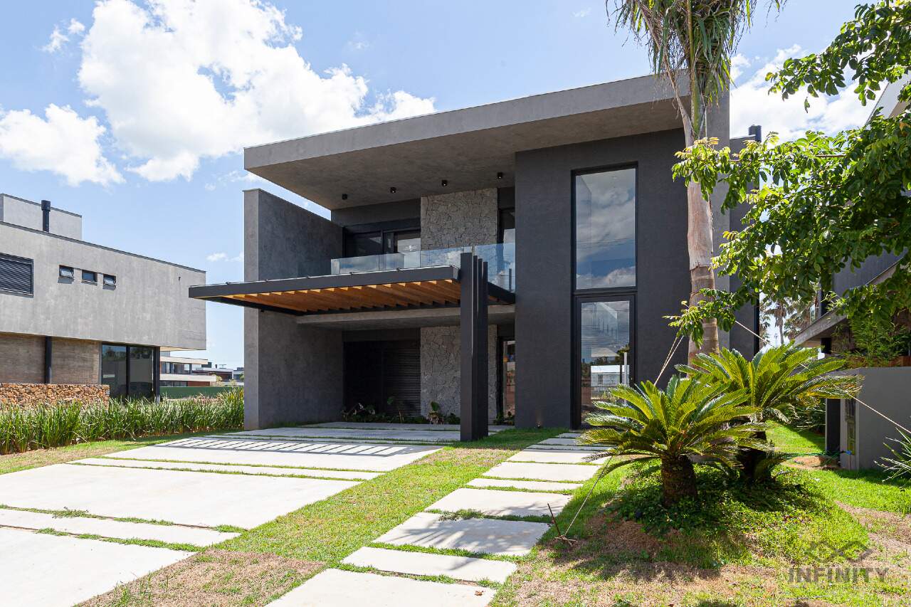 A cozinha tem conceito aberto, integrando-se a um amplo living com piscina e uma vista sensacional para o lago principal e palmeiras. A área externa conta com paisagismo que se integra aos móveis e à piscina.