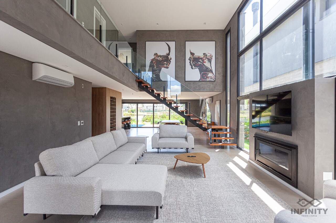 Na sala principal com o pé direito duplo, uma grande lareira para aquecer o clima durante o inverno, juntamente com boas conversas e taças de vinho.